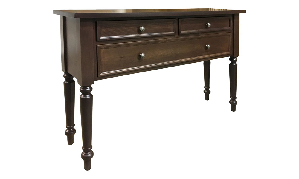 | 57" W x 16" D x 39" H | (4) turned legs from hardwood, (3) drawers in a two-over-one configuration, drawers on metal glide extensions |